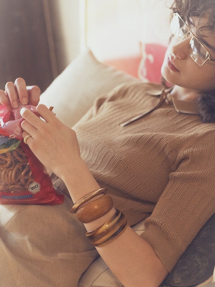 ゴールドバングル(上)、クリアブラウンバングル(下)/ともにアネモネ(サンポークリエイト) ウッドバングル(中)/SOKO、ゴールドピンキーリング/LUV AJ(ともにZUTTOHOLIC) ベージュポロニット/インディヴィ(ワールド プレスインフォメーション) リネンスカート/バナナ・リパブリック 眼鏡/レイバン(ルックスオティカジャパン カスタマーサービス) 透かし編みニットとリネンスカートに、ゴールドとウッド、マーブル柄。ドライなベージュから連想させて、手元もグラデーション。