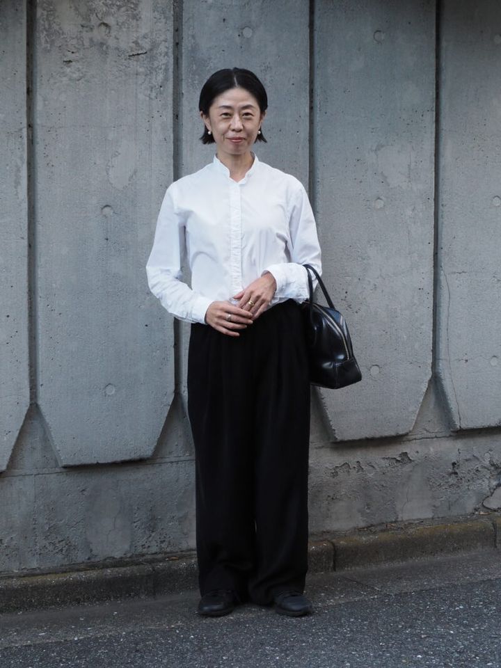 そんな松尾さんは、自身の凛とした雰囲気によく合うシックなスタイリングが得意。「コットン100%のシャツは友人がデザイナーを務める『ハンドルーム』のもので、着心地も使い勝手もいい。自然と袖を通したくなる魅力があります」。ワードローブに欠かせない定番アイテムなのだとか。