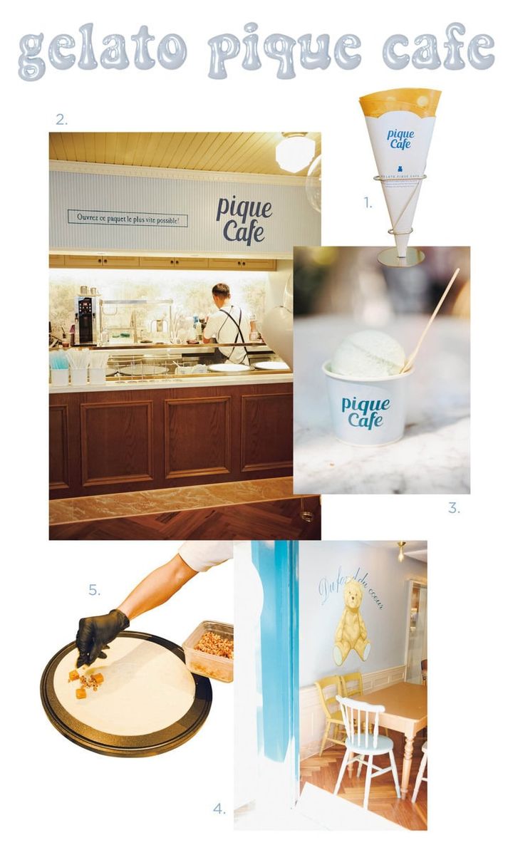 1&2&5.併設のジェラート ピケ カフェでは本場フランス産小麦を使用したクレープが食べられます。人気は塩キャラメルクレープ(₩6,500)。
