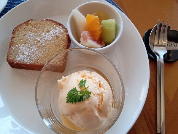 さて実食‼うん思った通り。米粉のパウンドケーキはしっとり目で生地がしっかりで食べ応え十分。手作りアイスが美味しくて、もうちょっと食べたいなぁって思うくらい。コクがあるのに後味はさっぱりでした。