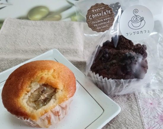 店主さんイチ推しの米粉のバナナマフィンとチョコマフィンです。バナナと米粉生地のミックスは想像以上に美味‼チョコマフィンはしっかりした生地にチョコの美味しさが詰まっています。トッピングのチョコの粒々感がたまりませ~ん。