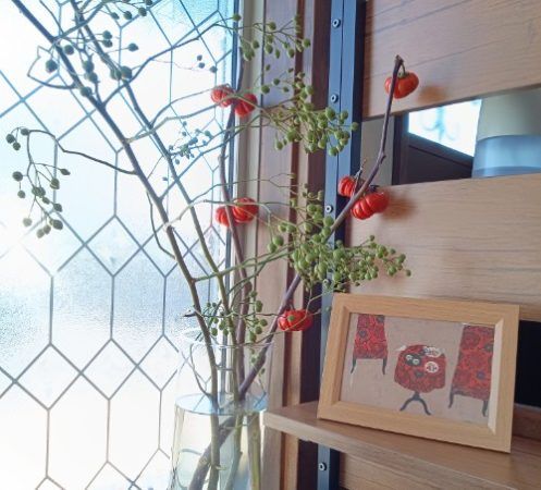 テーブル席とカウンター席の間にあるお花と飾り↑