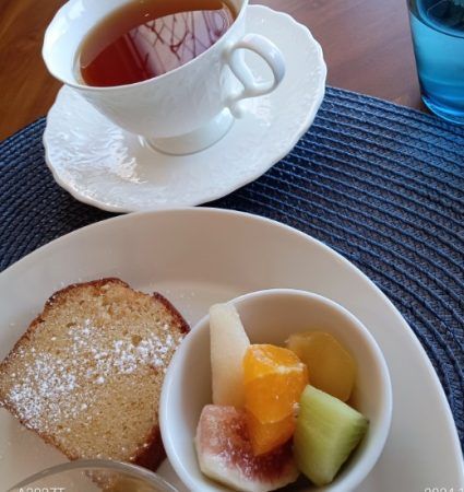 コーヒー率高めな私ですが、アップルティーを注文。スイーツプレートにフルーツが添えられていて、結果コーヒーよりフルーツに合ったかも知れません。お口の中がフルーティーになりました。