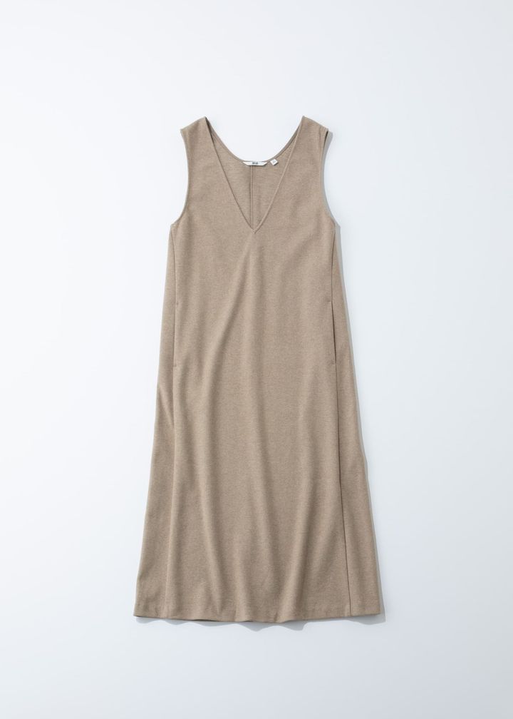 深めのVネックとスッキリしたラインのワンピースは、インナーによって着こなしが楽しめます。シンプルなロンTでカジュアルに、ボウタイブラウスで華やかにと、それぞれの表情を楽しんで。