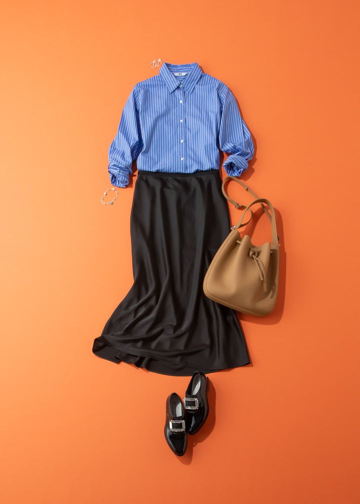 隠れ家的ビストロで気心知れた仲間とワインを楽しむ。そんな秋の夜には大人っぽコーデを意識。正統派ストライプシャツも、サテンスカートとビジューローファーならトラッドに終始しないコーデが完成。