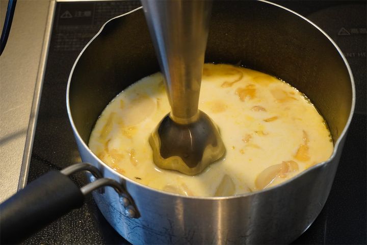 4.牛乳を加えて、ブレンダーで撹拌する。なめらかになったら鍋に戻して塩を加え、沸騰直前まで温める。仕上げに2と、お好みでこしょうをトッピングして完成。