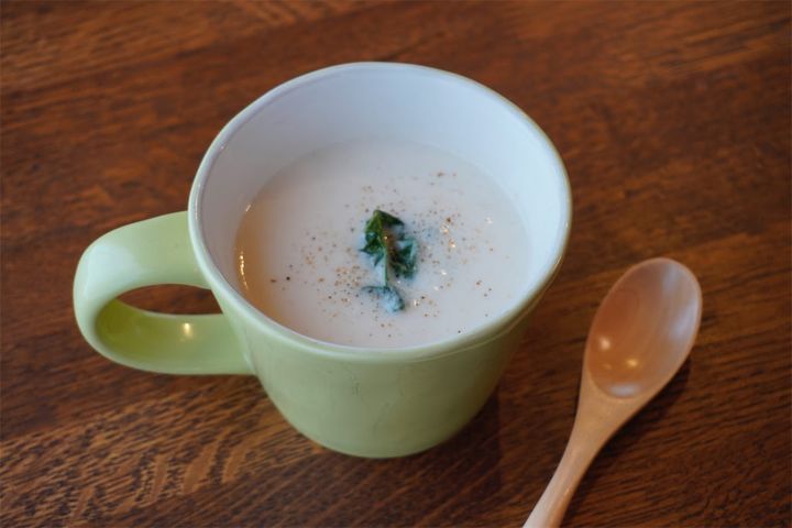 白いポタージュと鮮やかな緑色の葉の組み合わせがおしゃれですね!