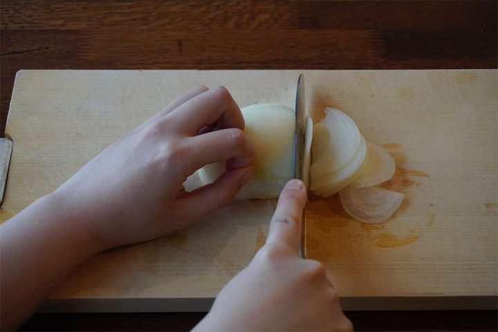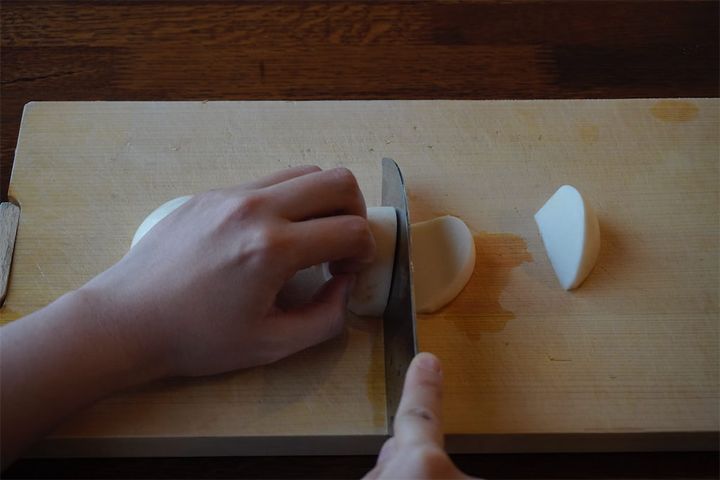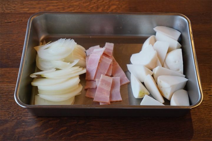 1.かぶは皮付きのまま8等分にくし切りにし、葉は取りわけておく。玉ねぎは薄く切り、ベーコンは1cm幅くらいに切る。