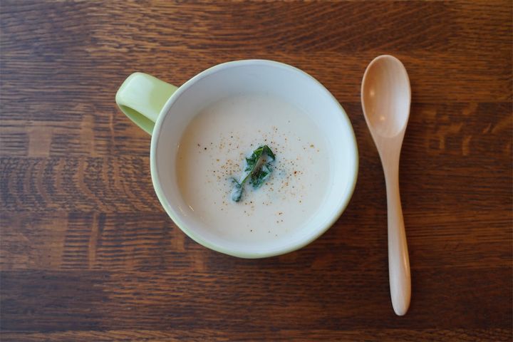 葉のシャキシャキ感とほろ苦さが、まったりしたポタージュの味を引き締めてくれます。