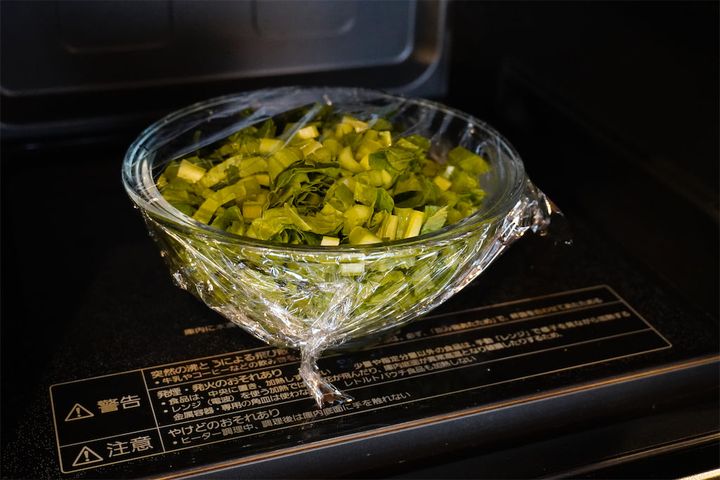 2.トッピング用の葉は細かく刻んでボウルに入れ、ラップをして600Wのレンジで3分加熱し冷ましておく。