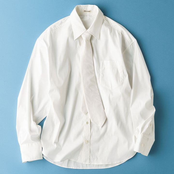 本格的な芯入りのネクタイが付いた、白のコットンシャツ。程良くゆとりのあるサイズ感です。