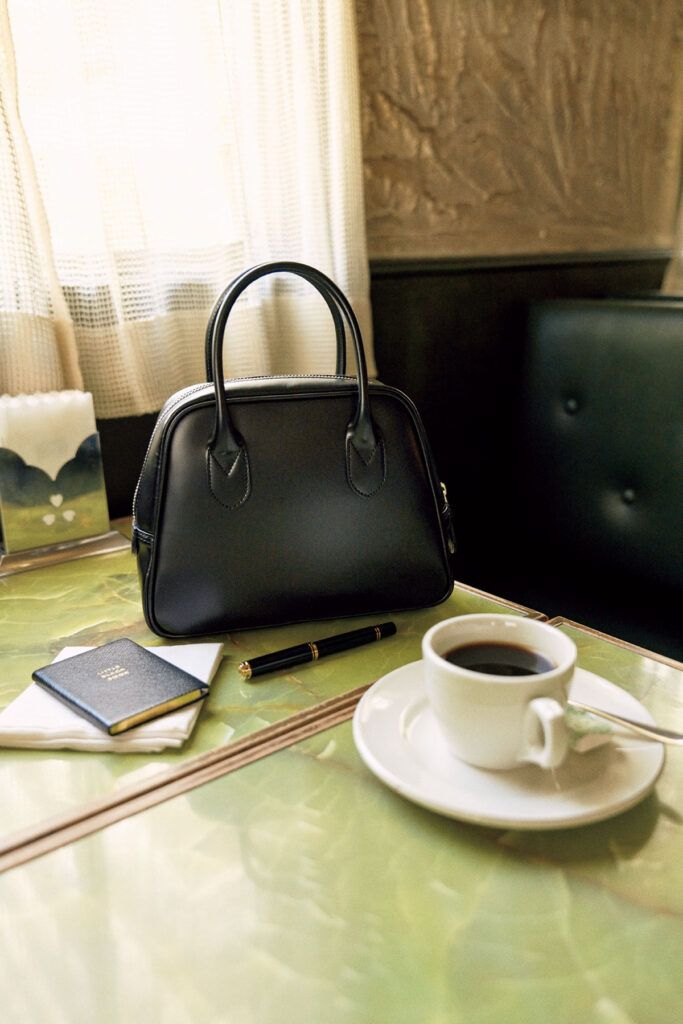 大人ならば、シンプルなものが似合う人でありたい。〈ショップ・コム デ ギャルソン〉定番のブラックレザーバッグを手に取るたびにそう思わされる。ハンドルと底鋲のみが付いたどこまでも潔いデザインと、優美でしっとりとした光沢は、使う人にも品格を求めているように見えるほど。滑らかな質感に仕上げられたステアガラスレザーからは、繊細な素材を丁寧に扱う、職人の手仕事が窺える。[W23×H18×D8㎝(持ち手11㎝)]¥48,400(コム デ ギャルソン 03−3486−7611) その他スタイリスト私物