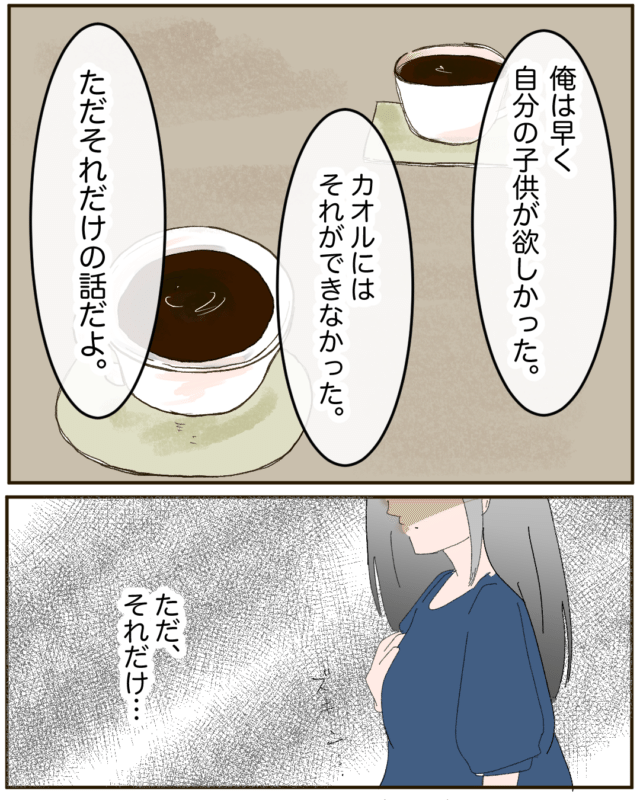 「俺は早く自分の子どもが欲しかった。カオルにはできなかった。ただそれだけだよ。」「・・・ただ。それだけ」