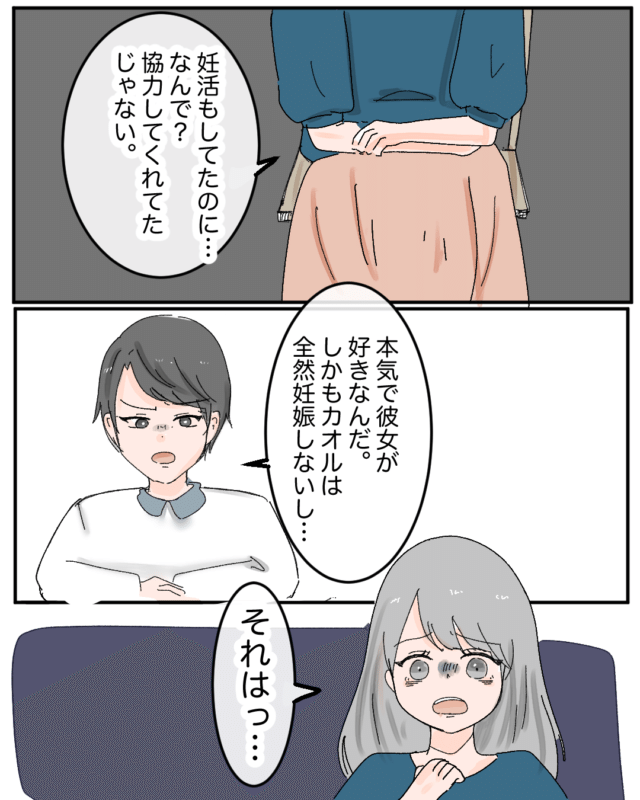 夫から「子どもがもうすぐ産まれる。もう8カ月になる」と言われたかおる(私)。子どもが欲しいと願っていた私にとって衝撃的な告白でした。