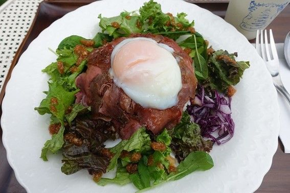 こちらは地元産の豊西牛を使った「ローストビーフプレート(1,200円)」です。かけられているドレッシングは自家製のもの。