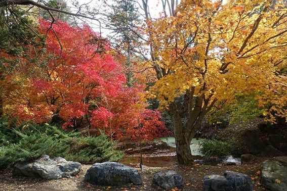 「真鍋庭園」の紅葉の特長は、赤一色ではなく針葉樹の緑、ポプラやキンカエデなどの黄色、ノルウェーカエデやカツラなどのオレンジといった色のコントラストを楽しめるところです。9月下旬ごろから徐々に色づき始め、10月中旬ぐらいにピークを迎えます。10月いっぱいぐらいまでは紅葉を楽しめるのだそう。
