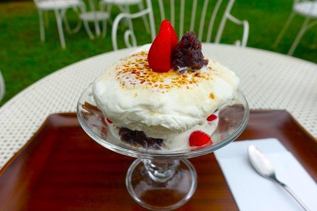 こちらはデザートの「ブリュレパフェ(900円)」です。十勝産牛乳を使ったミルクアイスの下には、もちもちの白玉がたっぷり。無料であんこかチョコのトッピングができます。ミルク以外にコーヒーもありますよ。