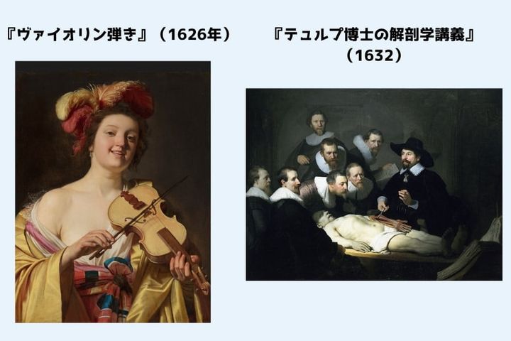 1つ目はオランダの画家ヘラルト・ファン・ホントホルスト(1592〜1656)の作品『ヴァイオリン弾き』(1626年)で、2つ目は同じくオランダの画家レンブラント(1606〜1669)の作品『テュルプ博士の解剖学講義』(1632)