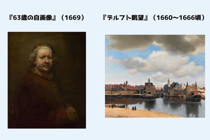 3つ目が同じくレンブラントの作品『63歳の自画像』(1669)で、4つ目がフェルメールの作品『デルフト眺望』(1660〜1666頃)です。