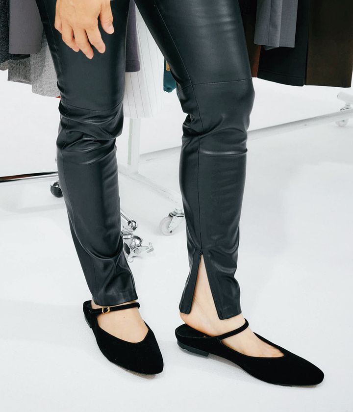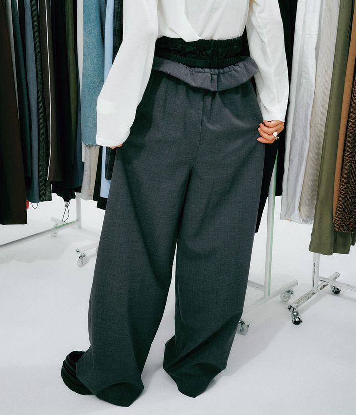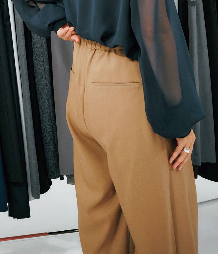 ほかのブランドと一線を画す。ボリューム系パンツはしなやか素材を。内側に向けて入ったインタックデザインは広がりも少なくスマート見え。ビッグジャケットのインは黒タンクでひきしめ華奢さを意識。