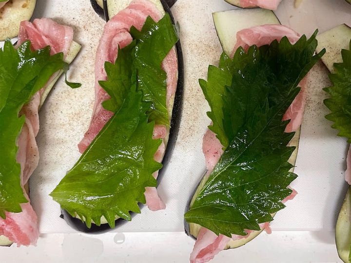 1. なすの断面に豚肉をのせ、塩、こしょうをふります。