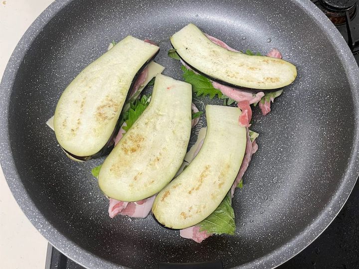 4. フライパンに油(分量外)を引き、なすの皮目を下にして入れ、フタをして1分加熱します。