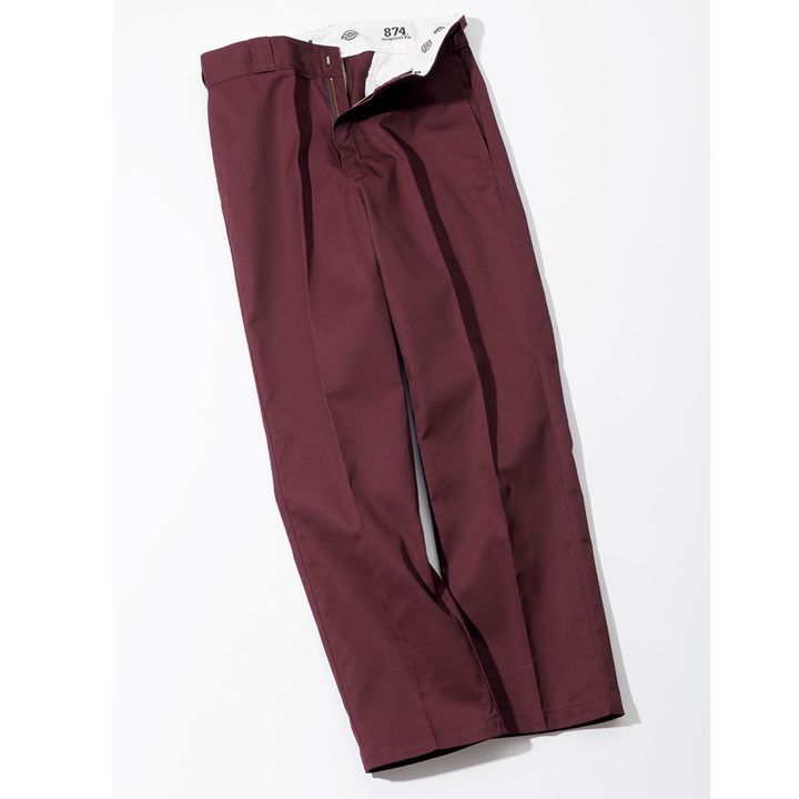 ジャストサイズで穿くとより丸みが活かされてレディな雰囲気に。上品&モードにふれる渋色でカジュアル感をセーブ。アイコン的存在の874シリーズはマルーンカラーを選んで大人見え。
