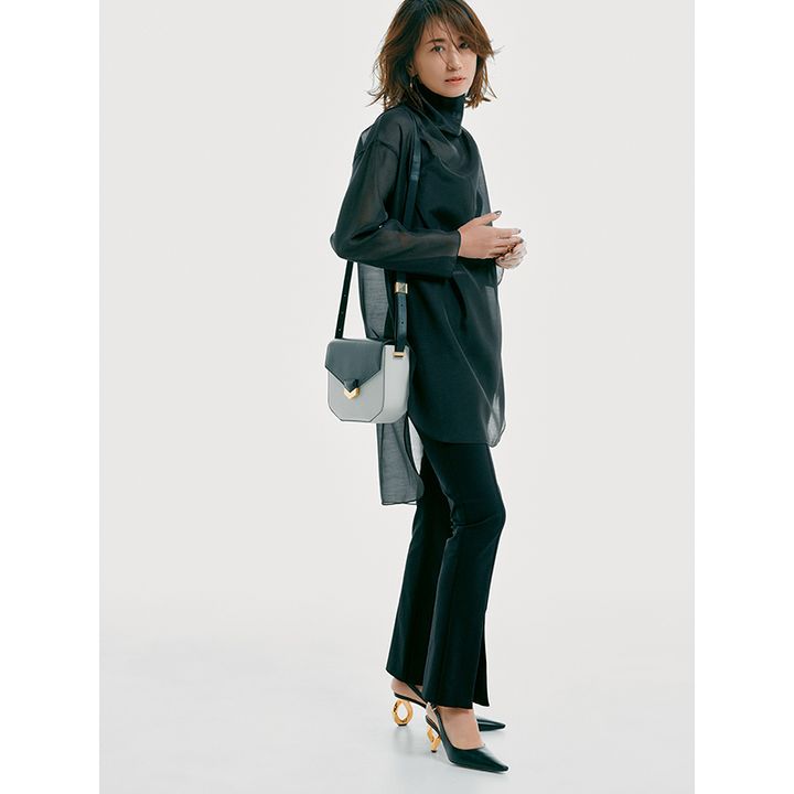 ブラウス¥18,700パンツ¥22,000〈ともにルフィル〉バッグ¥68,200〈デメリエー〉シューズ¥125,400〈J.W.アンダーソン〉(すべてルフィルニュウマン新宿店)中に着たタンクトップ[アンサンブル商品]¥19,800(エレンディーク)ピアス[片耳価格]¥206,965(キンレイデン/CPR トウキョウ)リン¥27,500(プラウ)