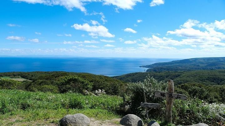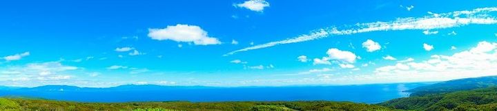 奥尻島の球島山から撮影した写真です。青い空と青い海が一望でき、その先にかすかに北海道の大地が見えます。