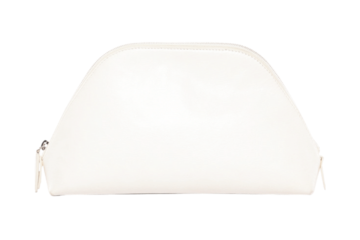 スッキリとした台形フォルムがミニマルな装いを約束。潔いホワイトも◎。バッグ〈デヴォン ポーチ〉[H14×W27×D8㎝]¥174,900(ザ・ロウ/ザ・ロウ・ジャパン)
