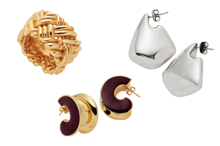 左から:イントレチャート柄をあしらったボリュームリング。リング[SV×K18YG]¥154,000、サイドにエナメルが施されたピアスは、見る角度で違った印象に。ピアス[SV×K18YG]¥221,100※参考色、フィンをモチーフにしたピアスは超軽量仕様でストレスフリーな着け心地。ピアス[SV]¥110,000(全てボッテガ・ヴェネタ/ボッテガ・ヴェネタ ジャパン)