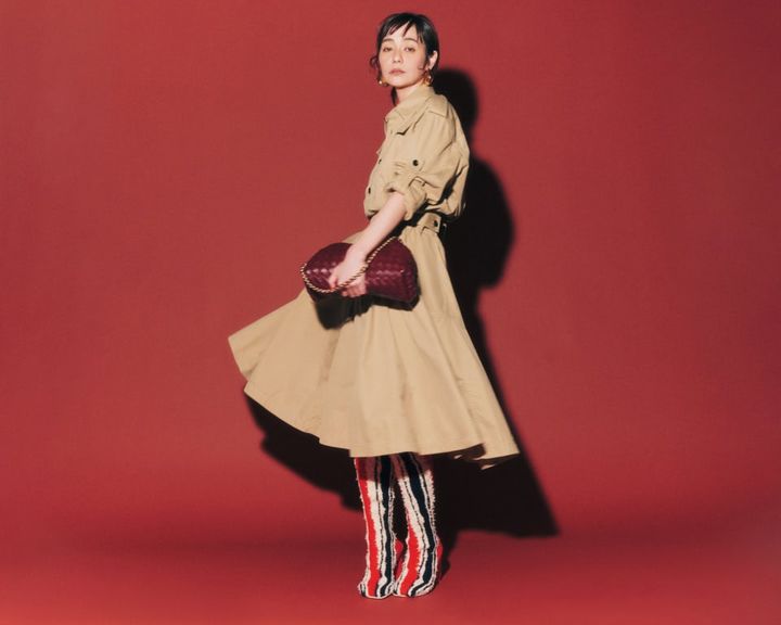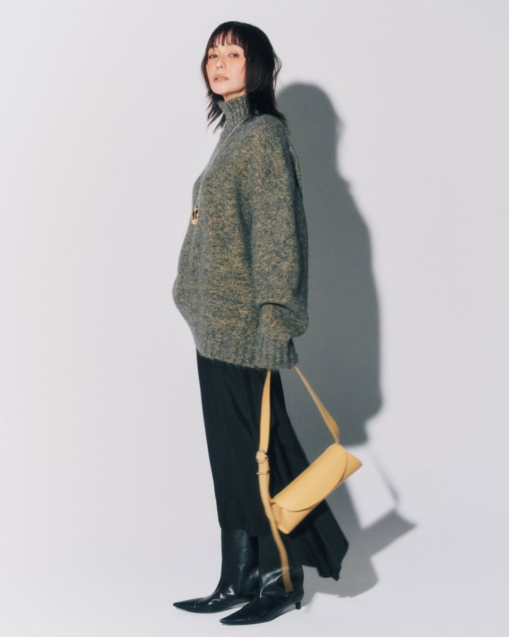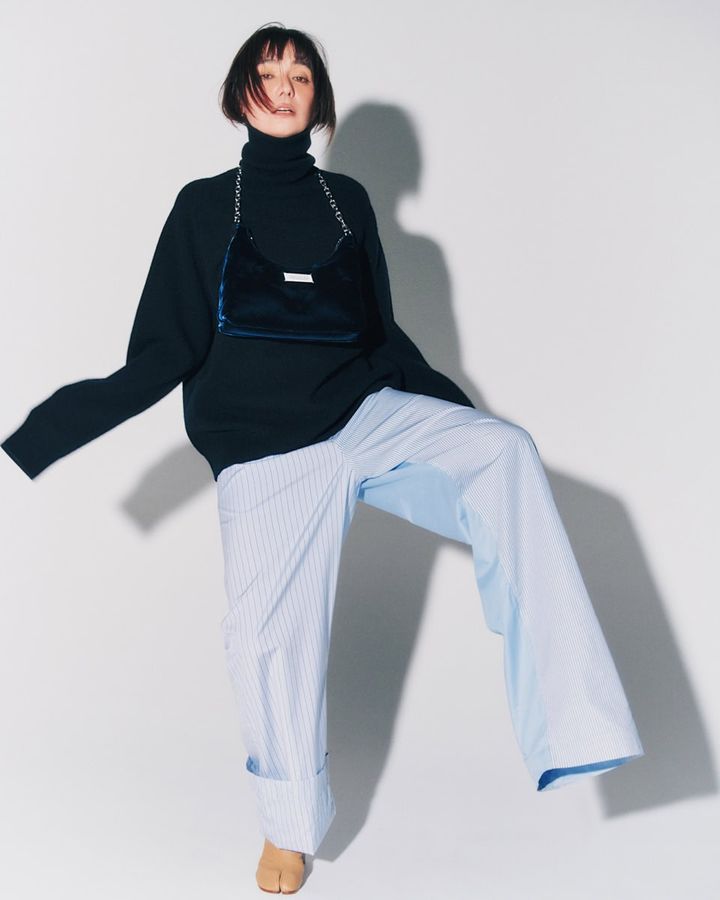玲奈着用:バッグ〈「グラム スラム」ホーボー スモール〉[H21×W28×D6㎝]¥301,400、ブーツ〈「タビ」ブーツ〉[ヒール8㎝]¥189,200、ニット¥214,500、パンツ¥152,900、ピアス¥41,800(全てメゾン マルジェラ/マルジェラ ジャパン クライアントサービス)