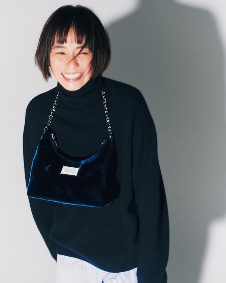 ベルベットが高級感溢れるバッグを中心に、ネイビー×ブルーでまとめたカジュアルルック。ラフなムードのなかにもモードさが感じられるのはさすが。バッグ〈「グラム スラム」ホーボー スモール〉[H21×W28×D6㎝]¥301,400、ニット¥214,500、パンツ¥152,900、ピアス¥41,800(全てメゾン マルジェラ/マルジェラ ジャパン クライアントサービス)