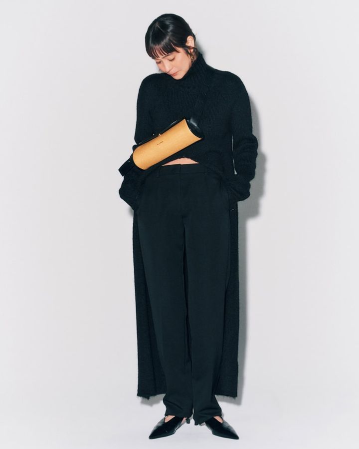 ラフィア×レザーの組み合わせにノックアウト間違いなしのカンノーロ。ウォーミーなロングニットドレスに、あえて軽やかな素材を合わせるギャップが洒落感たっぷり。バッグ〈カンノーロ スモール ラフィア〉[H11×W29×D10㎝]¥236,500、ニットドレス¥382,800、パンツ¥173,800、ピアス¥116,600、パンプス[ヒール3.5㎝]¥151,800(全てジル サンダー バイ ルーシー アンド ルーク・メイヤー/ジルサンダージャパン)
