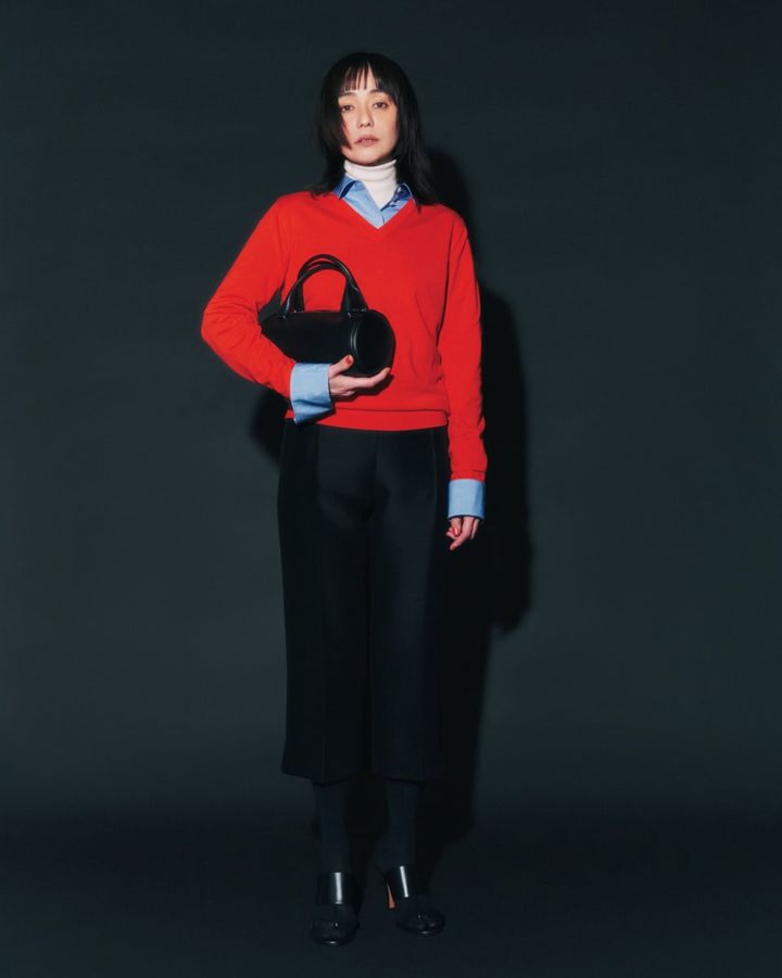ハイゲージニット、シャツのレイヤリングはコンパクトなシルエットとクロップトパンツが新鮮。どこかトラッドなムードが漂いながらも、タイツやヒール、ラウンドフォルムのバッグでフェミニンかつモダンな印象に。バッグ〈エディス〉[H12.5×W28×D12.5㎝]¥328,900、Vネックニット¥218,900、シャツ¥196,900、タートルネックニット¥229,900、パンツ¥174,900、サンダル[ヒール9㎝]¥240,900(全てザ・ロウ/ザ・ロウ・ジャパン)、ソックスはスタイリスト私物