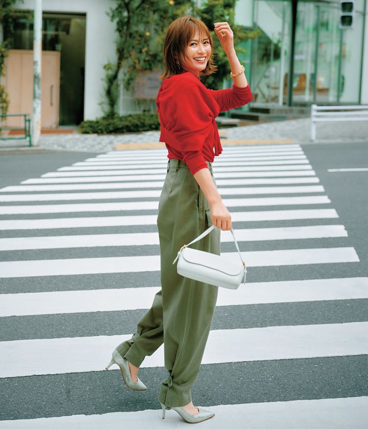 ニット¥39,600肩に掛けたニット¥53,900(ともにエイトン/エイトン青山)パンツ¥22,000(アンド アールシー/カレンソロジー二子玉川)バッグ¥141,900(J&M デヴィッドソン/J&M デヴィッドソン カスタマーセンター)パンプス¥71,500(ペリーコ/アマン)ピアス¥30,800ブレスレット¥26,400(ともにローラ ロンバルディ/八木通商)