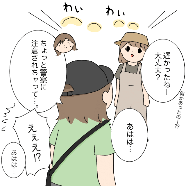 そして、他のママ友達が待っている公園の中へ。「遅かったねー。大丈夫?何かあったのー??」とたずねられたいくこさん、「ちょっと警察に注意されちゃって・・」と答えると「えぇえ!?」と驚かれてしまいました。