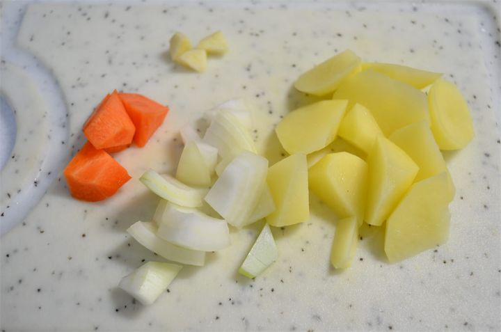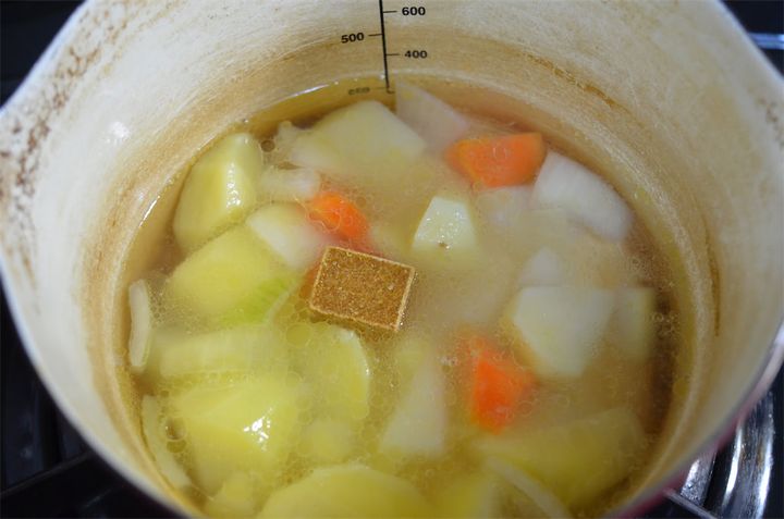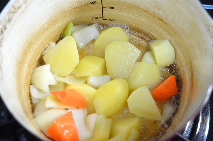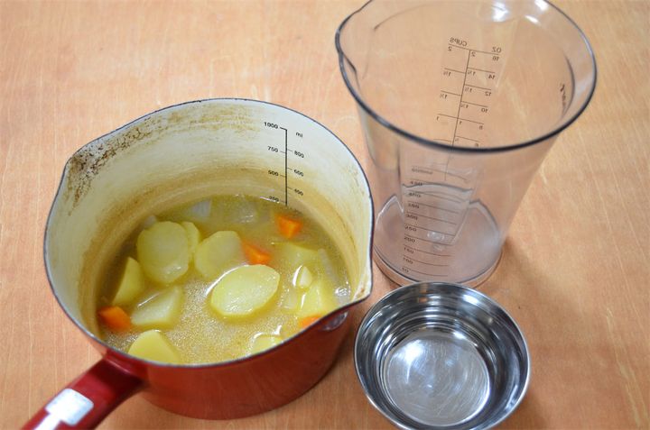 1.じゃがいも、玉ねぎ、にんじん、にんにくを乱切りにする。鍋にサラダ油とバターを熱し、乱切りにした野菜を炒めたら、水130mlとコンソメを加えて煮る。野菜が少し硬いうちに火を止める。