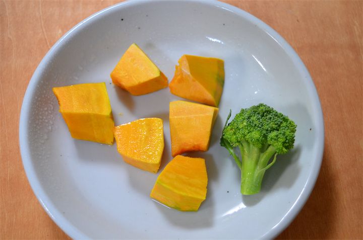 5.かぼちゃは一口大に切って皮を剥き、ブロッコリーと一緒に600Wのレンジで約1分加熱して柔らかくする。