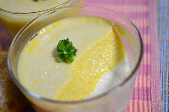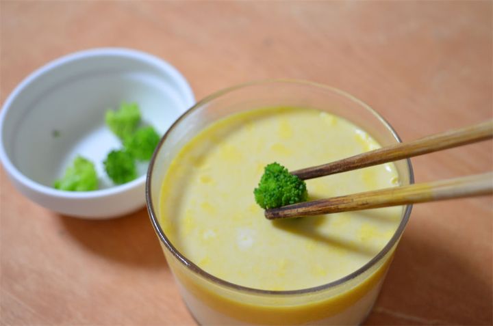 9.固まったじゃがいもスープの上に粗熱を取った8を入れ、冷蔵庫で固め、仕上げにブロッコリーをのせる。
