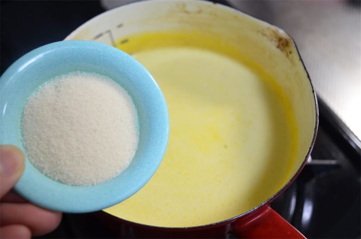 8.鍋に7を入れ、火にかける。周りがフツフツしてきたら火を止め、ゼラチンを少しずつ加えてよく混ぜる。