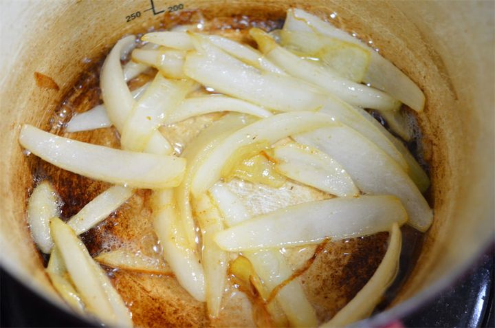 6.玉ねぎはくし切りにし、バターで色が変わるまで炒める。