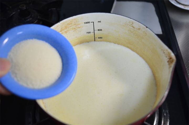 3.鍋に、2と牛乳、生クリームを入れ火にかける。周りがフツフツしたら火を止め、ゼラチンを少しずつ入れながらよく混ぜる。