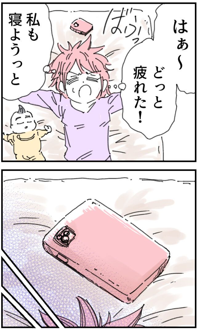 「はぁ~どっと疲れた!私も寝ようっと」あれこれ考えて疲れてしまったかおりさんは、こはるちゃんと一緒にお昼寝することにしました。