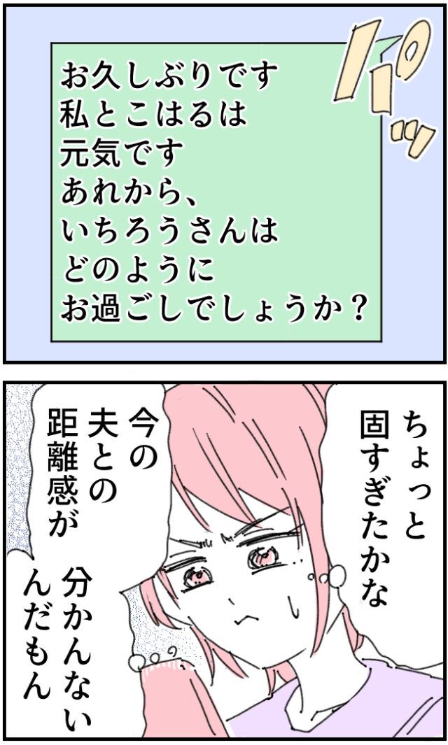 「お久しぶりです。私とこはるは元気です。あれから、いちろうさんはどのようにお過ごしでしょうか?」という自分の送ったメッセージを読み返しながら「ちょっと固すぎたかな。今の夫との距離感が分かんないんだもん」と戸惑うかおりさん。