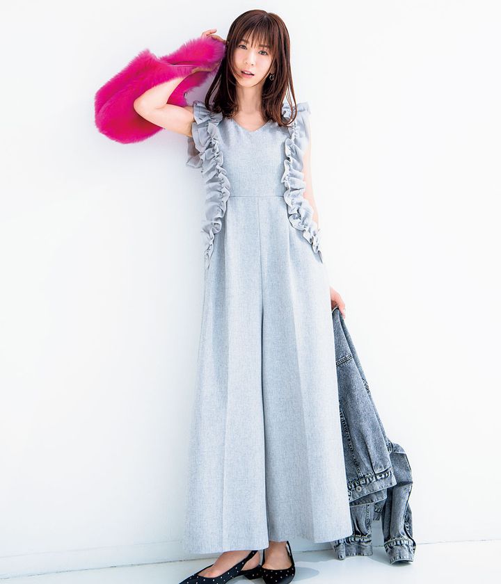 オールインワン¥25,300(マイストラーダ)手持ちのデニムジャケット¥18,700(アルページュストーリーオリジナル)バッグ¥70,400(カール・ドノヒュー/アルアバイル)フラットシューズ¥26,400(ツル バイ マリコ オイカワ)ピアス[片耳]¥26,400(メゾン ヴァジック/ヴァジックジャパン)
