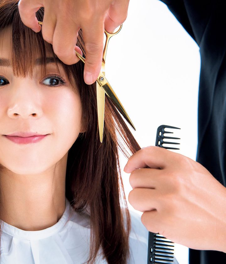 毛先を8cm、前髪を少し幅広めにカット。顔周りの髪に独立したレイヤーを入れ、