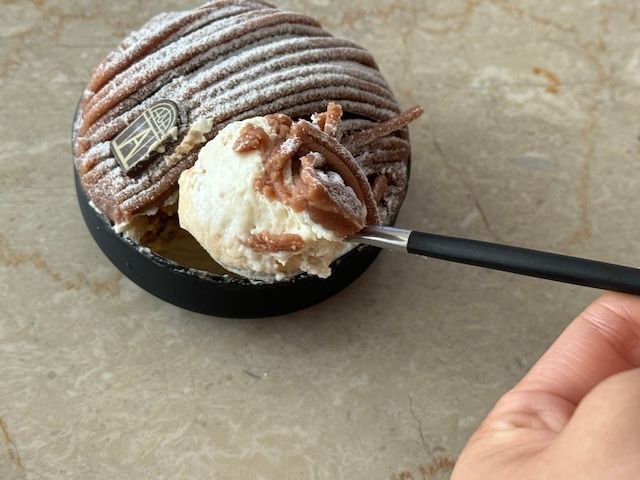 見た目はモンブランですが、スプーンを進めるとブラウンシュガーでキャラメリゼされたパリッとした感触が! バニラビーンズたっぷりのクリームと濃厚なマロンクリームの組み合わせはまた定番のモンブランとは異なった味わいを感じられます。伝統を守りながら、進化しづける名店の味わいは、本当におすすめです。