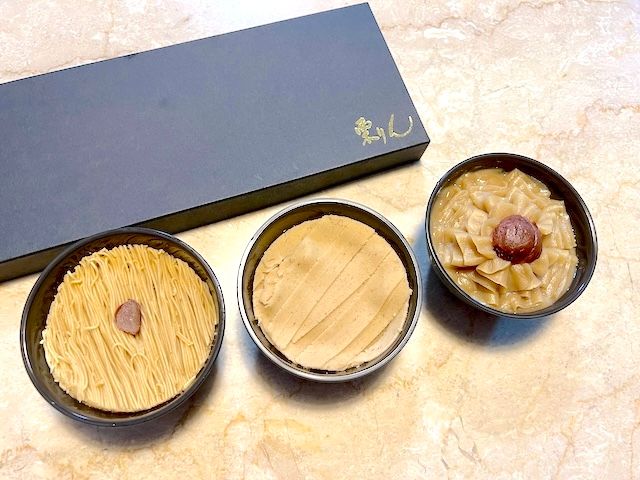 今、販売されているものだと、香りのよい茨城県産(タルト)、 甘みの強い愛媛県産 (栗ムース)、風味豊かな熊本県産 (マロンクリームとメレンゲ)の食べ比べができるそうです。
