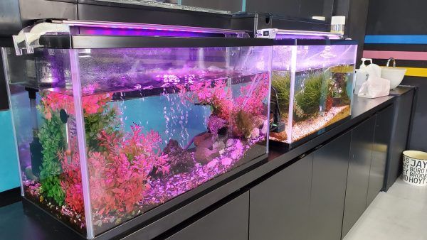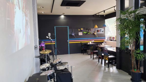 正面ドアを入ってすぐのカウンターでスタッフの方に"スイーツカフェを利用します"と声をかけて店内へ。中に入ると、広々とした空間にお魚さんがいる水槽やドラムセット。そして、好きな席についてメニューを選びます。